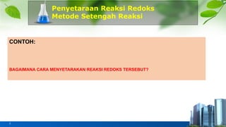 Dokumen ini menjelaskan metode penyetaraan reaksi redoks menggunakan metode setengah reaksi. Terdapat langkah-langkah yang diuraikan, termasuk penulisan persamaan setengah reaksi reduksi dan oksidasi, serta cara menyeimbangkan unsur, molekul air, atom hidrogen, muatan, dan menggabungkan persamaan setengah reaksi. Contoh dan latihan disertakan untuk pemahaman lebih lanjut.
