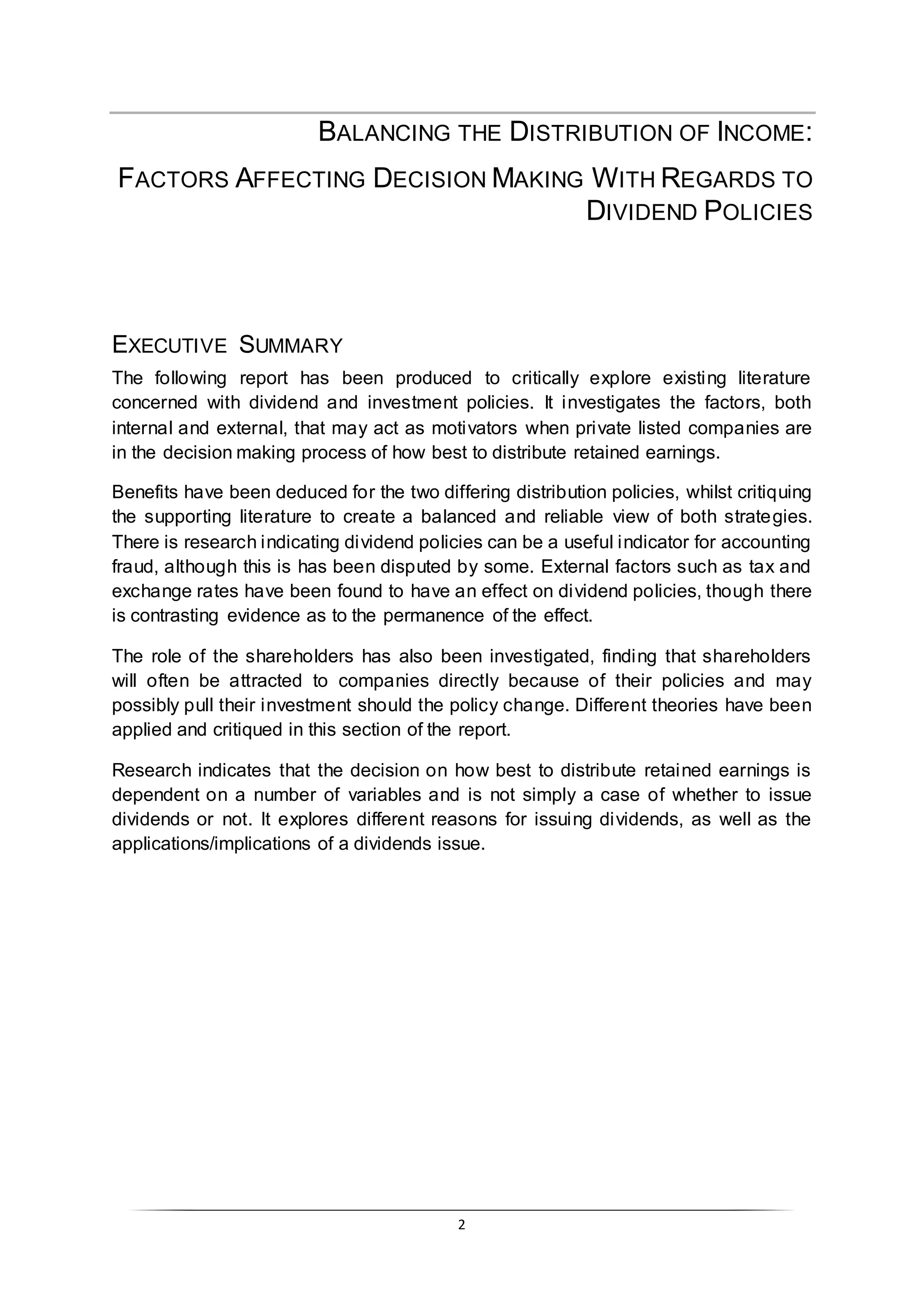 This report investigates factors influencing dividend policies in private listed companies, including internal motivators, external factors like tax implications, and shareholder attitudes. The analysis covers the valuation impacts of dividend issues, the relationship between dividends and fraud, and the theories surrounding capital distribution strategies. It concludes that decisions regarding dividend allocation are complex and influenced by a multitude of economic and strategic considerations.