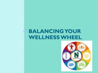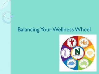 This document discusses wellness and balancing the six dimensions of wellness: physical, intellectual, emotional, social, spiritual, and occupational. It provides an assessment for readers to evaluate their wellness across these six dimensions by filling out a "wellness wheel" diagram. The assessment addresses topics like nutrition, exercise, relationships, stress management, learning, and more. After completing the wheel, the document guides reflection on strengths and weaknesses, goal setting, and resources for improvement. The overall message is that balancing all dimensions leads to better wellness, and the wheel can help individuals gain self-awareness and make a plan to enhance their wellness.