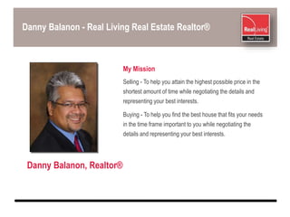 This document provides information about Danny Balanon and the real estate services he offers for buying and selling homes. It summarizes his mission to help clients attain the best price and negotiate deals in their best interests. It also includes Danny's credentials, experience, testimonials, and contact information to showcase his expertise and client-focused approach.