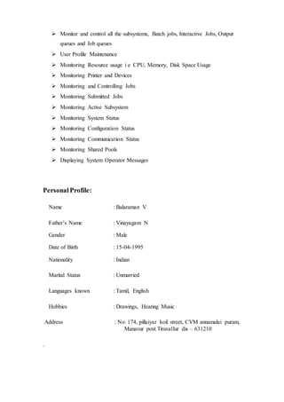 Balaraman V is seeking a challenging position in a progressive organization. He has a Diploma in Mechanical Engineering from Murugappa Polytechnic College with 87% and completed 12th grade with 67%. His technical skills include IBM i administration and operations, networking, and Microsoft Office. He has experience monitoring and controlling jobs, user profiles, printers and devices on IBM i systems. Balaraman is looking to apply his knowledge and perform to the expectations of an organization.