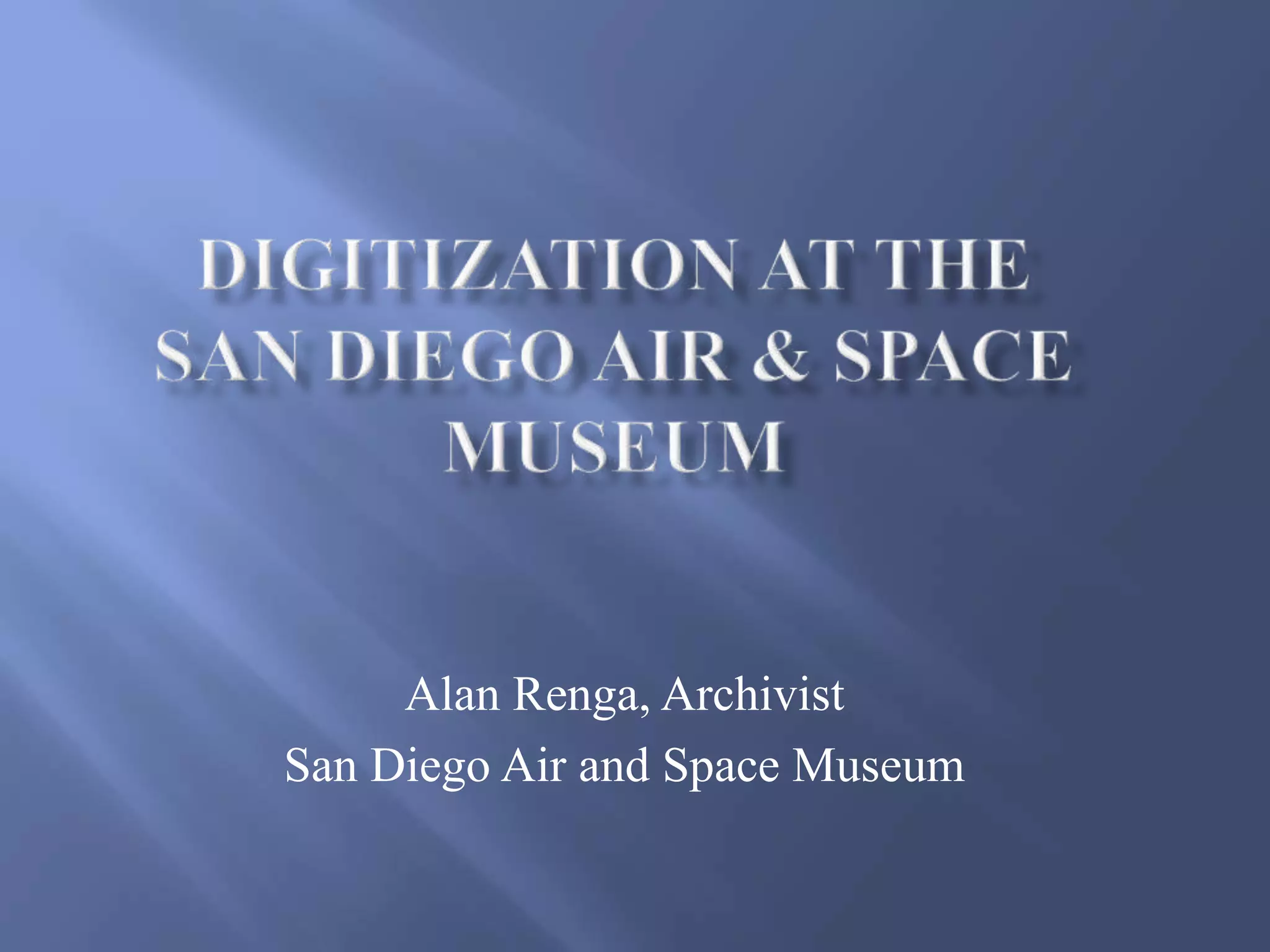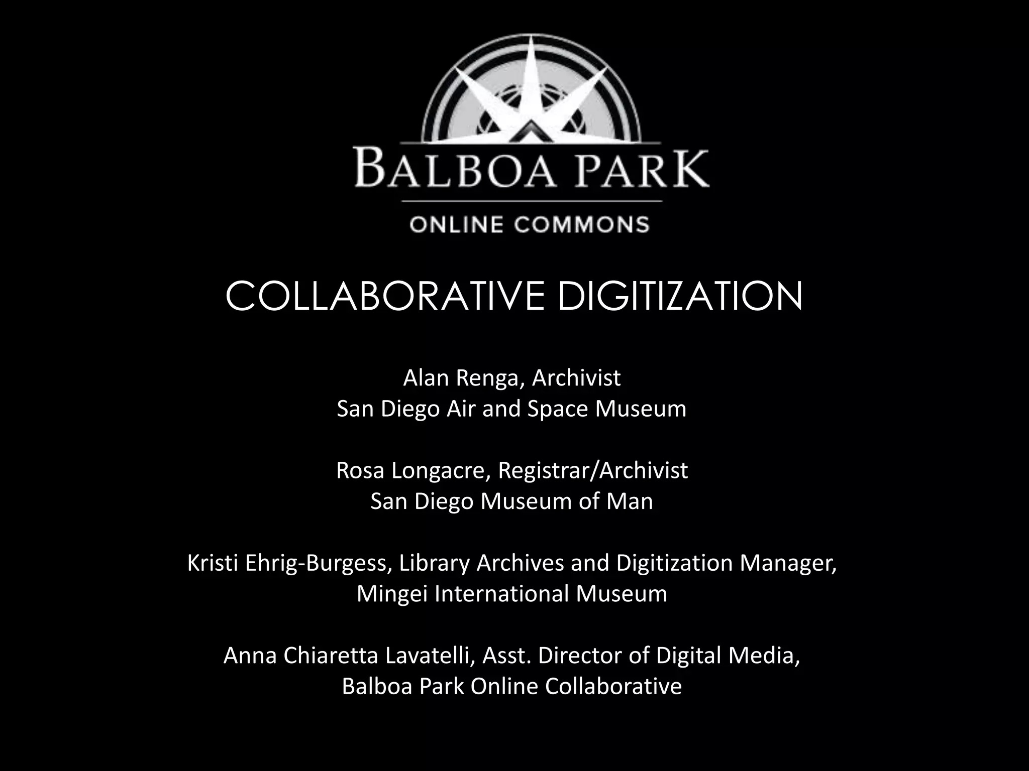 The document outlines collaborative digitization efforts among various institutions in San Diego, emphasizing the preservation of extensive aviation and cultural heritage through digitization. Key highlights include the San Diego Air and Space Museum's archives housing over 2 million items and the San Diego Museum of Man's cataloging initiatives supported by grants. Challenges such as metadata integration and diverse media formats are addressed, alongside the connection of resources through the Balboa Park Online Collaborative.