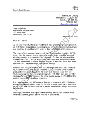 The document presents an analysis of Baldwin Bicycle Company's (BBC) proposal from Hi-Valu to produce a low-cost Challenger bicycle line under a private-label agreement. The proposal could yield substantial incremental revenues but deviates from standard practices and poses significant financial risks due to unfavorable payment terms and BBC's already high debt-equity ratio. Recommendations suggest pursuing short-term agreements or distribution partnerships to mitigate risks while considering a potential restructuring of operations.
