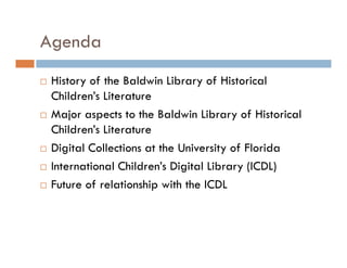 The Baldwin Library of Historical Children's Literature is the second largest children's literature collection in the US, with over 120,000 books, manuscripts, and artifacts. It began as a private collection donated to the University of Florida in the late 1970s. The Baldwin Library has digitized over 5,800 public domain titles, which are available through the University of Florida Digital Collections and the International Children's Digital Library. The Baldwin Library is the largest single contributor to the International Children's Digital Library in order to increase global access to and discovery of its historical children's literature holdings. The Baldwin Library aims to continue strengthening its collaborative relationship with the International Children's Digital Library.