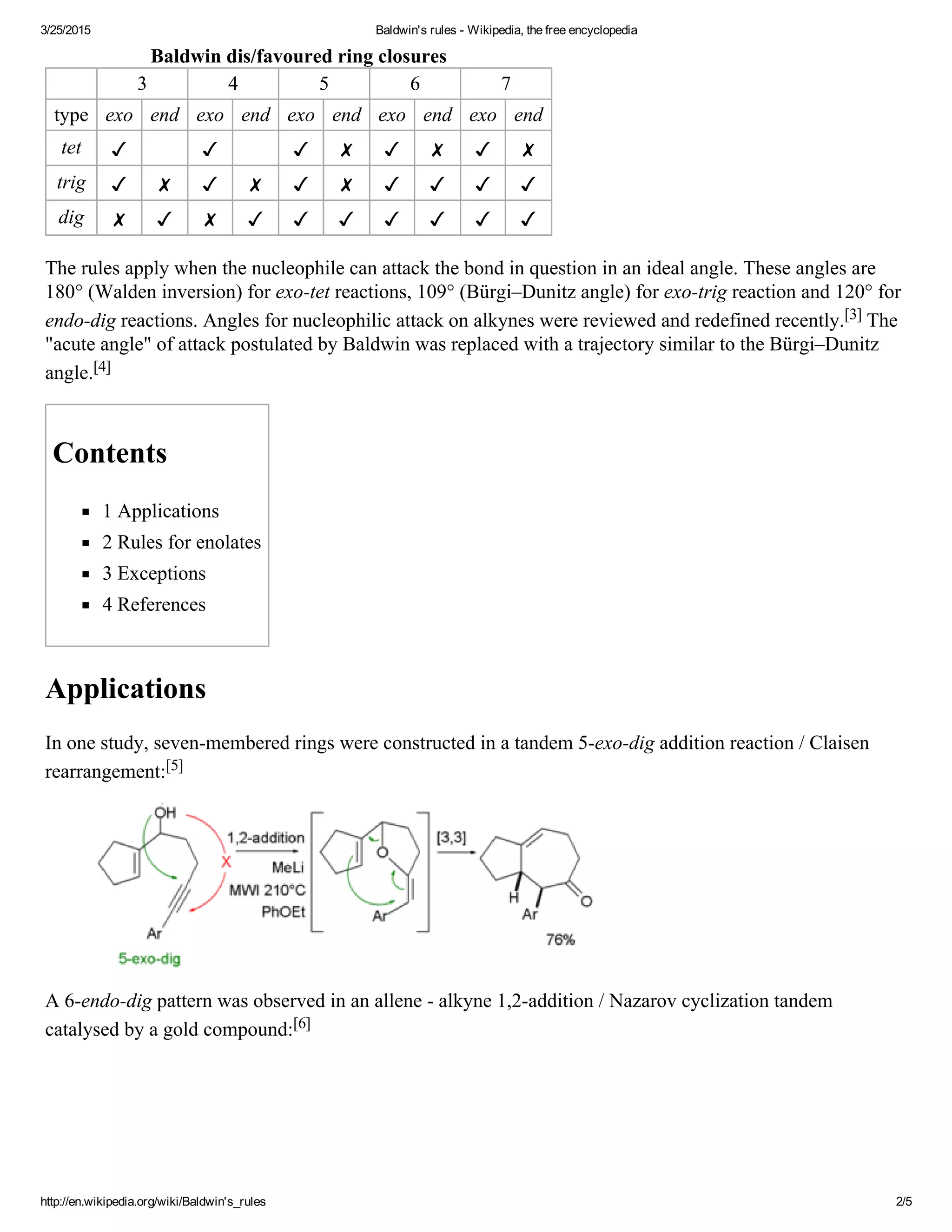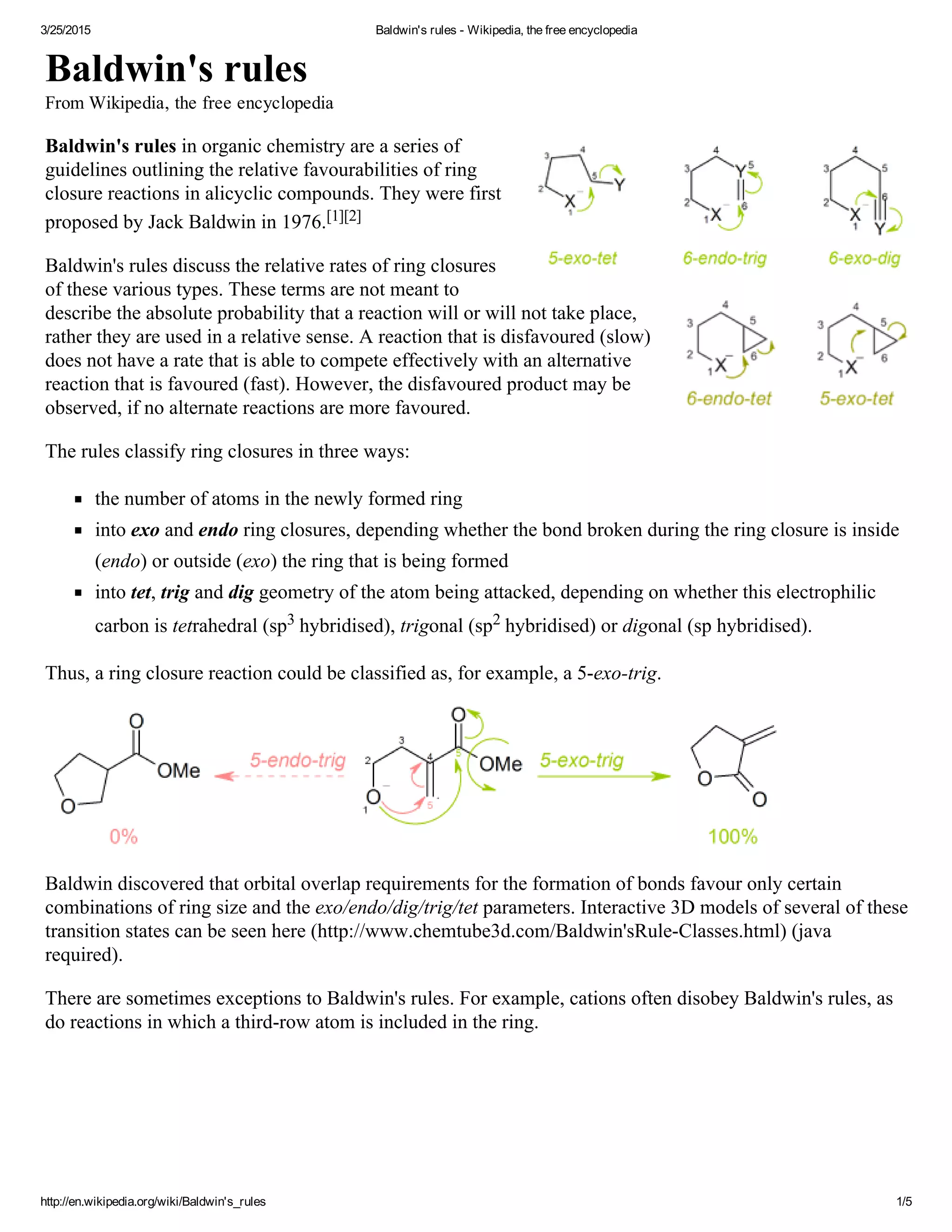 Baldwin's rules outline guidelines for ring closure reactions in alicyclic compounds. They classify ring closures based on the number of atoms in the newly formed ring, whether the bond broken is inside or outside the ring (endo or exo), and the geometry of the atom being attacked (tetrahedral, trigonal, or digonal). Baldwin discovered that orbital overlap requirements favor certain combinations of these parameters. Exceptions can occur for reactions involving cations or third-row atoms. The rules help determine the relative rates and favorability of different ring closure reactions.