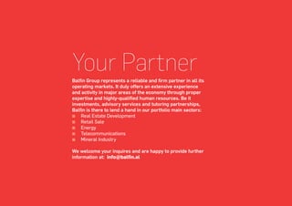 Balfin Group is a large private investment group based in Albania that operates in several sectors including real estate development, retail, energy, telecommunications, and mining. Founded in 1993 in Vienna, Austria, Balfin Group has expanded its operations to include multiple countries in Southeast Europe. It offers advisory services, partnerships, and investments focused on real estate, retail, energy, telecommunications, and mining industries. Balfin Group aims to be a reliable partner through its expertise and qualified human resources.
