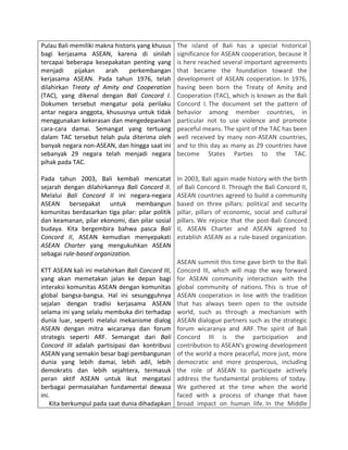 Dokumen ini menjelaskan peran penting Pulau Bali dalam sejarah kerjasama ASEAN, termasuk lahirnya berbagai kesepakatan seperti Treaty of Amity and Cooperation dan Bali Concord II yang mendorong pembangunan komunitas ASEAN. Di samping itu, terdapat penekanan pada perlunya ASEAN untuk menjadi lebih proaktif dalam menangani isu-isu global dan meningkatkan perannya dalam interaksi dengan komunitas internasional. Rangkaian agenda pada KTT ASEAN juga dipaparkan untuk memperkuat kerjasama dan stabilitas di kawasan, serta menghadapi tantangan yang ada.