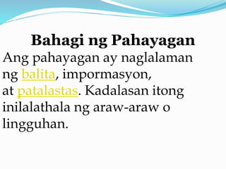 Ang dokumento ay naglalarawan ng mga pangunahing bahagi ng pahayagan na naglalaman ng balita at impormasyon. Kabilang dito ang pangmukhang pahina, balitang pandaigdig at panlalawigan, editoryal, balitang komersyo, anunsyo klasipikado, obitwaryo, libangan, lifestyle, at isports. Ang bawat bahagi ay may kanya-kanyang nilalaman na nagbibigay-kaalaman tungkol sa mga kasalukuyang kaganapan at usaping panlipunan.