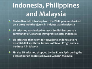 This document summarizes the activities of the Etniko Bandido Infoshop from the Philippines during a three month sojourn in Indonesia and Malaysia. It describes their work teaching English in Bali, reconnecting with farmer communities in Indonesia, and visiting an autonomous space in Kuala Lumpur during protests. It also discusses various autonomous activist spaces and networks in Southeast Asia working on issues like agrarian struggles, arts initiatives, and women's rights.