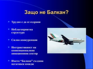 Защо не Балкан?Трудно е да се оздрави Неблагоприятна структура Силна конкуренция Неетрактивност на конвенционалния авиационния сектор Името “Балкан” създава негативен имидж