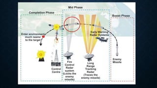 This document provides an overview of ballistic missile systems. It begins with definitions of missiles and their classification. It then discusses the key components of ballistic missiles, including warheads, fuses, guidance systems, and propulsion systems. The document outlines the working principle of ballistic missiles and describes their flight in different phases. It also briefly discusses the history of ballistic missile development in India.