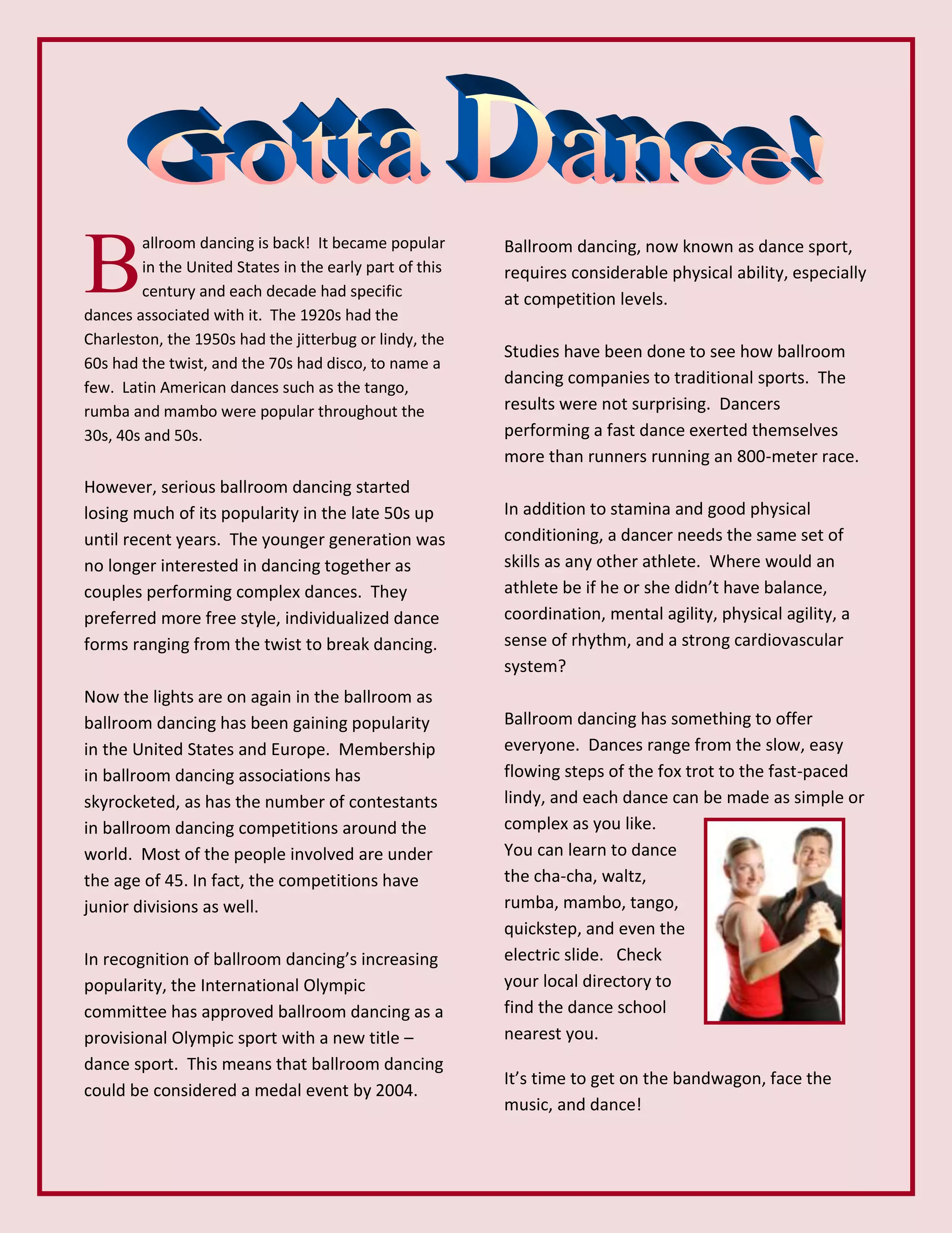Ballroom dancing saw a resurgence in popularity in the late 20th century. Specific dances like the Charleston, jitterbug, and twist were popular in different decades from the 1920s to the 1970s. While ballroom dancing declined in popularity from the late 1950s, membership in dance associations and competitions has increased, especially among those under age 45. Ballroom dancing is now recognized as a potential Olympic sport called dance sport, requiring athletic skills like stamina, coordination, and cardiovascular strength.
