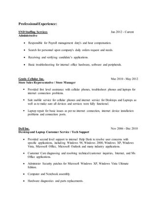 Balmore Garcia is a computer technician with over 6 years of experience maintaining, installing, and troubleshooting networks, desktops, laptops, and peripherals. He is seeking a position that allows him to utilize his skills and experience to best serve an IT department and its goals. Garcia has extensive technical expertise in operating systems, networks, hardware, software, and email/web applications. He has held positions providing technical support, customer service, and sales/repair of computers and mobile devices.