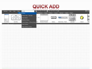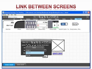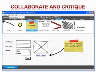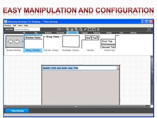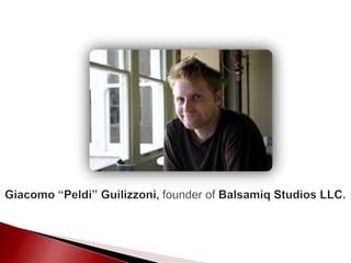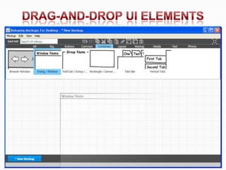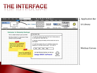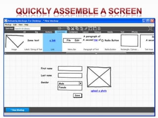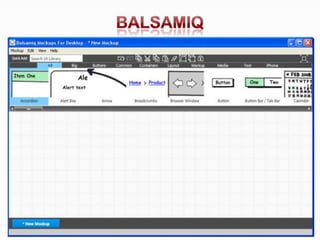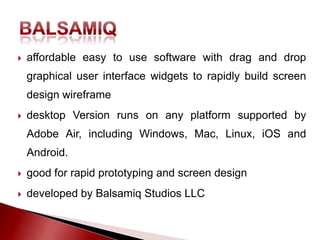 Balsamiq is a wireframing and prototyping tool that allows users to quickly create low-fidelity mockups of websites and apps. It has a simple drag-and-drop interface with pre-made widgets and icons to build screen designs. The desktop version runs on Windows, Mac, Linux, iOS, and Android, and it can export designs as PNG or PDF files. Balsamiq is intended for rapid prototyping early in the design process to visualize and share ideas with teams.
