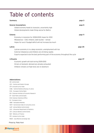 The document outlines a pessimistic macroeconomic outlook for the Baltic region in light of a global recession, with Estonia, Latvia, and Lithuania all facing negative GDP growth in 2008 and challenging conditions ahead. Despite slight recovery prospects for 2010, significant risks persist due to weak domestic demand, rising unemployment, and difficulties in accessing foreign financing. The Baltic economies will likely rely more on domestic resources while contending with the burdens of high energy costs and the ramifications of global economic turmoil.