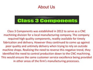 Class 3 Components, established in 2012, is a Baltimore-based CNC machine shop that focuses on high-quality precision machining and timely delivery in-house. They utilize top-of-the-line automated CNC machines and offer a variety of services, including inspection and machining for various materials, with minimum order requirements depending on the service. The company prioritizes customer service and fair pricing while providing specialized machining services up to 6 inches in diameter.