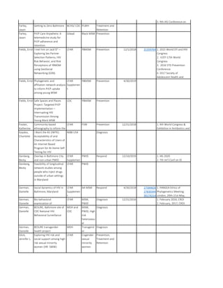 This document lists several investigators, their projects, funders, key populations studied, pillars of work (prevention, diagnosis, treatment, response), end dates, and any publications or presentations. The projects cover a wide range of populations including people who inject drugs, men who have sex with men, transgender individuals, sex workers, and focus on prevention, diagnosis, treatment and response work related to HIV/AIDS in Baltimore.