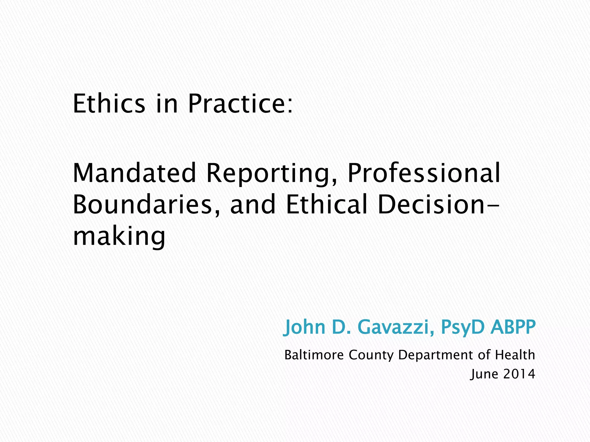 This document outlines ethics considerations for social workers including mandated reporting, professional boundaries, and ethical decision-making models. It discusses the differences between ethical, legal, and risk management concerns. It also provides a model for integrating professional ethics codes with personal values called the acculturation model. The model examines how well social workers identify with professional ethics codes and their own personal values systems. The document concludes by discussing cognitive biases and emotions that can influence ethical decision-making.