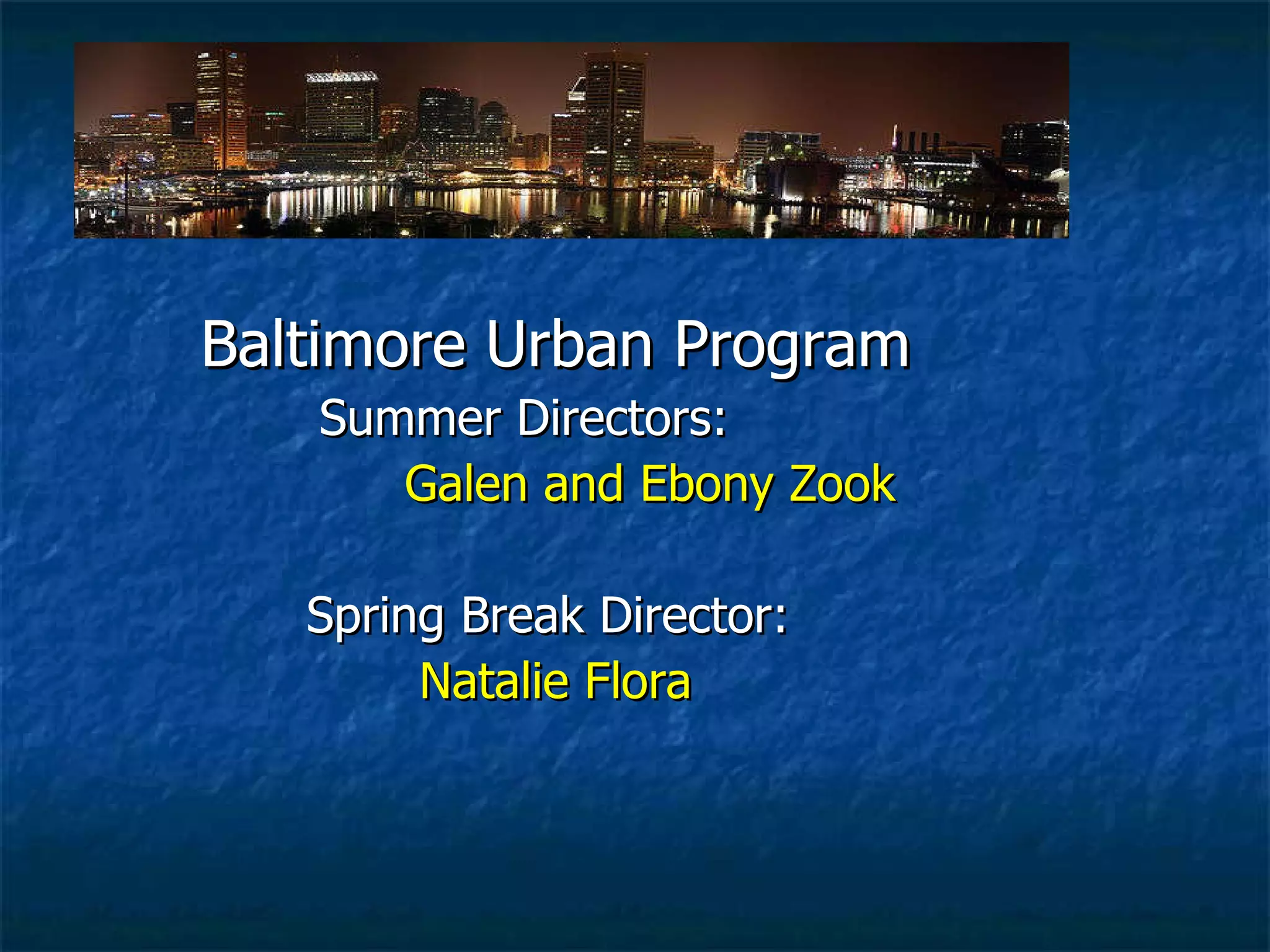 - The goals are to give students practical experience in urban ministry, provide service to the community, and help students see Baltimore in a new light by exposing them to the ways God is working there.