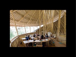 The document provides examples of architectural projects that utilize bamboo as a building material. It lists the names of over 15 buildings, structures, furniture pieces and artworks made of bamboo from locations around the world like Taiwan, France, Thailand, New York, Haiti, China, and Japan. The document emphasizes that bamboo can be used for building surfaces, structures, membranes and joinery.