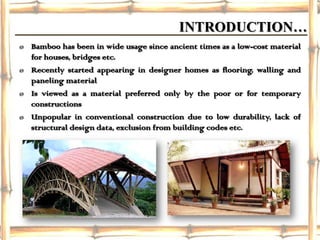 Bamboo is a strong, flexible, sustainable building material that has been used for construction purposes for centuries, however its use has been limited due to a lack of structural design data and exclusion from building codes; the document discusses bamboo's mechanical properties and provides examples of how it can be used for building foundations, walls, roofs, and as reinforcement in concrete as well as methods for protecting bamboo through borax treatment.