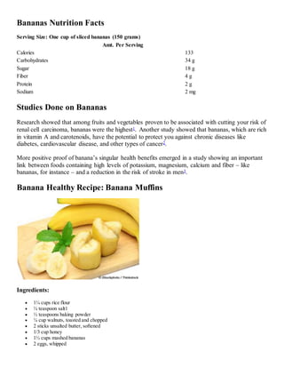 Bananas are one of the most popular fruits in the world due to their convenient size, packaging, and low cost. They provide many health benefits such as potassium to regulate blood pressure, vitamin C for immune support, and antioxidants that combat free radicals. Studies show bananas may reduce the risk of diseases like cancer, diabetes, and stroke. While bananas are highly nutritious, they should be consumed in moderation due to their natural sugar content.