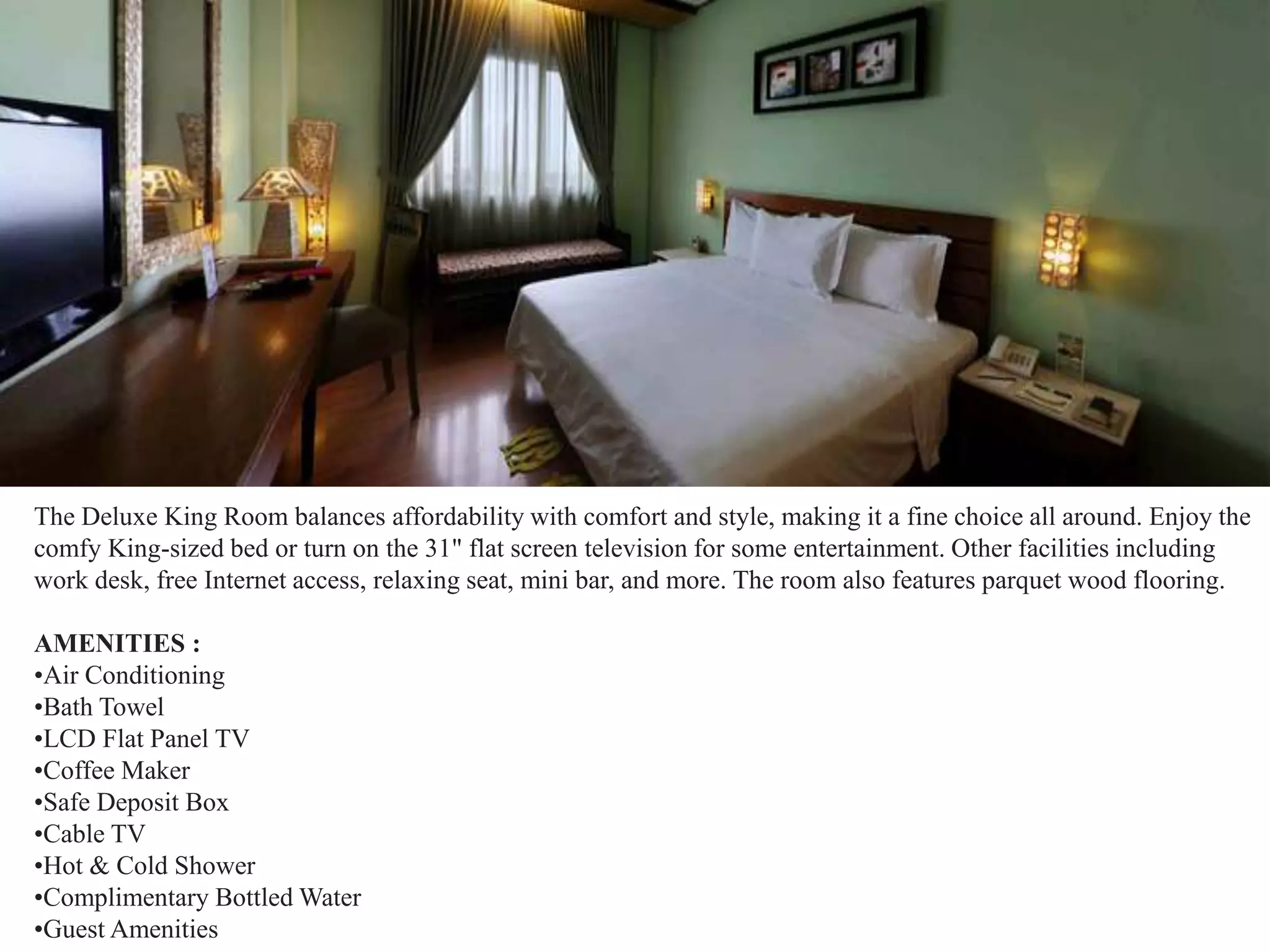 The document describes 5 different room types - Deluxe King Room, Deluxe Twin Room, Studio Twin Room, Studio King Room, Executive King Room, and Suite Room - at a hotel. Each room type provides details on amenities like a king or twin bed, TV, desk, mini bar, and amenities like air conditioning, towels, and WiFi. The rooms also feature parquet wood flooring.