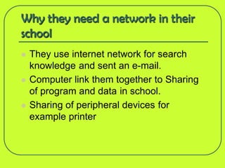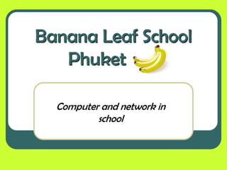 The document summarizes the network needs of Banana Leaf School in Phuket, which has 4 buildings with 80 classrooms total and 1000 students. It estimates they will need 100 computers total, with 70 for student use, 25 for teachers, and 5 for the library. The hardware required includes 210 monitors, keyboards, mice and CPUs as well as 10 projectors, speakers and microphones. The recommended software includes Microsoft Office, antivirus software, Photoshop, dictionaries, web browsers and media players. A local area network within each building connected by a campus area network is suggested, along with wireless connectivity for mobile devices. Diagrams of sample classroom and overall networks are provided.