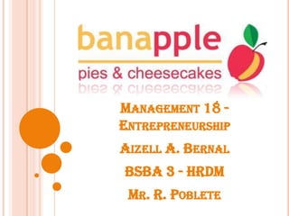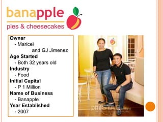 GJ Jimenez and Maricel, his wife, started Banapple in 2007 in Quezon City with 1 million pesos of initial capital. Maricel has experience as a baker and GJ has marketing skills. They first sold Maricel's cakes and pastries through other shops. In 2007 they opened their own small shop called Banapple, known for banana toffee and apple pies. The business grew and they now have 5 branches, expanded their menu, and employ GJ's IT skills to manage operations.