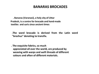 Banaras brocade, originating from the holy city of Varanasi, is renowned for its exquisite silk textiles with intricate gold and silver weaving techniques. Historically significant, this craft has strong cultural ties, influenced by various regions and religions, with specific motifs and colors favored by different communities. Today, the demand for Banaras brocade remains high, merging traditional designs with contemporary fashion, as seen in collections by notable designers.