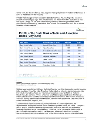 The State Bank of India implemented the largest centralized core banking system in history to modernize its technology and remain competitive. It selected Tata Consultancy Services to implement the TCS BaNCS system across SBI's over 14,600 branches and affiliate banks, involving converting around 140 million accounts. The project was highly successful and expanded in scope from an initial 3,300 branches to include all SBI branches. The implementation established SBI as a leader in offering innovative products and services across India.