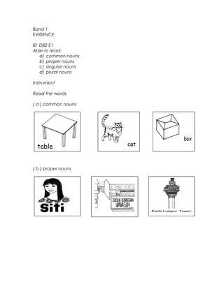 This document outlines performance standards and evidence for students in Year 3 of primary school in Malaysia. It addresses several English language skills including reading, writing, and use of nouns. For reading, students should be able to read common nouns, proper nouns, singular nouns, and plural nouns. For writing, the performance standard specifies students should write phrases, sentences, and numerals legibly with correct spelling and penmanship. Evidence items assess reading these parts of speech and writing phrases, sentences, and numerals in word and numeral form.