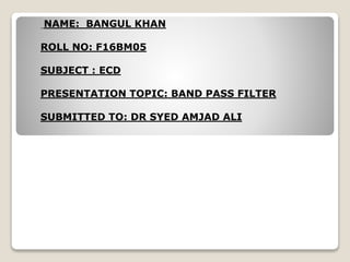 The document discusses band pass filters, which are electronic devices that allow signals between two specific frequencies while rejecting others, combining properties of low and high pass filters. It describes two types of band pass filters: active (requiring external power) and passive (using only passive components), along with schematic diagrams for both. Applications include their use in wireless transmitters and receivers, where they limit bandwidth and allow for the decoding of signals within a specific frequency range.