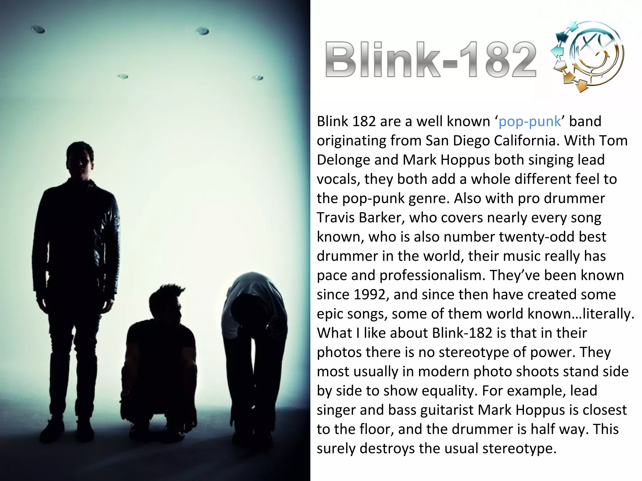 Blink-182 is a well-known pop-punk band from San Diego, California formed in 1992. With vocalists Tom Delonge and Mark Hoppus contributing different styles, and drummer Travis Barker, one of the best drummers in the world, their music has pace and professionalism. They have created some iconic songs over their career. The band presents an image of equality, with members standing side by side rather than in stereotypical rock band poses.