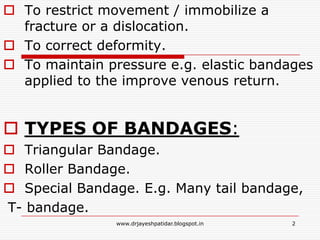 Bandaging involves covering wounds or injuries to provide support, immobilization, and protection. Common bandage materials include cotton, gauze, and elastic bandages. The appropriate bandage type and size depends on the body part and purpose. Proper bandaging techniques such as padding bony areas and applying pressure evenly without restricting circulation are important to promote healing and prevent further injury. Splints are rigid structures used to immobilize fractures and dislocations by preventing movement at the injury site. Common splints include the Thomas splint for femur fractures and Bohler-Braun splint for skeletal traction of femoral fractures.