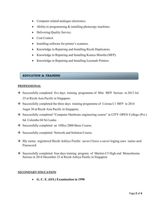 Pushpanath Bandara is seeking a challenging position that utilizes his 11 years of experience in technical and solution work for Ricoh multifunctional devices. He currently works as a senior technical and solution engineer for E-Wis Peripherals, having previously worked for 7 years as a senior technician at Hideki International. He has experience in areas such as networking, firmware updating, identifying faults, basic electricity, computer electronics, programming and installing photocopiers, delivering quality service, cost control, and installing software. He has completed several training programs in Singapore and Sri Lanka and holds a GCE O/L and A/L qualification from Prince of Wales College in Moratuwa.