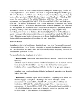 The document provides an executive summary for a project on Bandarban, a district in Bangladesh known for its natural beauty and tourism potential. The project aims to highlight an underexposed tourism site in Bangladesh. Key reasons for choosing Bandarban included its natural attractions like waterfalls and lakes, hilly terrain with the country's highest peaks, and Buddhist temples. The summary discusses difficulties faced due to lack of information on the area. It acknowledges help received from instructors and peers to present the project in an innovative way using course materials. The goal is to fulfill the demand of adventure travelers and increase interest in the region.