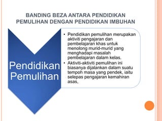 Dokumen ini membandingkan pendidikan pemulihan, yang membantu murid dengan masalah pembelajaran tanpa mengira latar belakang sosioekonomi, dengan pendidikan imbuhan yang ditujukan kepada murid dari golongan bawahan untuk mengatasi ketidaksamaan dalam akses pendidikan. Pendidikan pemulihan lebih terhad kepada pembelajaran di bilik darjah, sementara pendidikan imbuhan merangkumi sokongan luar seperti bantuan makanan dan kewangan. Objektif pendidikan pemulihan adalah untuk memperbaiki kemahiran asas, manakala pendidikan imbuhan bertujuan merapatkan jurang pendidikan antara golongan kaya dan miskin.