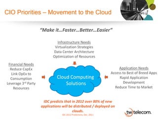 tw telecom's Intelligent Network helps businesses connect to cloud computing solutions and applications providers by providing visibility, flexibility, and control over their network and traffic. It offers value-added capabilities like enhanced management of bandwidth and application-aware networking to support changing IT strategies and consumption models. The network connects enterprises, data centers, and applications providers to create an ecosystem for businesses adopting cloud and virtualization solutions.