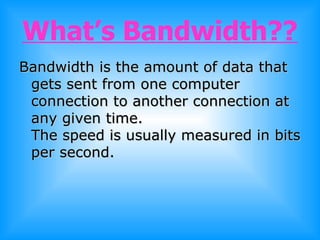 Bandwidth refers to the amount of data that can be transmitted between computer connections at any given time, typically measured in bits per second. It is crucial for fast data transfer, allowing for quicker access to web pages and downloads. Internet service providers offer bandwidth by renting high-speed connections to consumers for a fee.