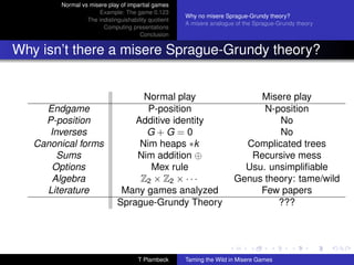 The document discusses normal and misere play of impartial games. It begins with an example of the game 0.123 in both normal and misere play. It then explores why there is no misere analogue to the Sprague-Grundy theory for normal play. The document proposes using indistinguishability quotients and computing presentations to generalize the Sprague-Grundy theory to misere play. It provides examples of computing outcomes in misere 0.123 using relations in the commutative semigroup. The document also discusses using the Knuth-Bendix process to obtain a confluent rewriting system to simplify computations in the semigroup.