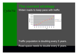 The document summarizes the issues with Bangalore's traffic and proposes solutions. It argues that [1] widening roads is not a long term solution as traffic will only continue to increase, [2] building metro rail is too expensive and will take 100 years to complete, and [3] the bus is the best solution to provide public transportation. Buses can carry many more people than individual vehicles and greatly reduce traffic, pollution, and infrastructure costs when widely adopted. The document advocates for increasing bus usage and non-motorized transportation like cycling to simplify commutes without harming the city.