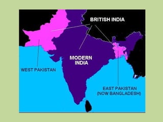 The document summarizes the creation of Bangladesh from East Pakistan. It describes the vast differences between East and West Pakistan, the political tensions that arose after the Awami League won elections in 1970 but was denied governing power by the West Pakistani military ruler. This led to riots in East Pakistan and a deadly crackdown by the Pakistani army that killed an estimated 1 million Bengalis over nine months and displaced millions more to India. Ultimately, India intervened on behalf of East Pakistan, helping them gain independence as Bangladesh in 1971.