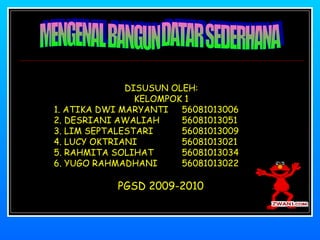 Dokumen ini membahas tentang bangun datar sederhana, yaitu segitiga, segiempat, dan lingkaran, beserta identifikasi dan sifat-sifatnya. Rincian juga diberikan mengenai jenis-jenis segitiga dan segiempat serta cara mengajar yang melibatkan pengenalan bentuk melalui benda konkret. Selain itu, media pengajaran yang digunakan termasuk benda-benda di kelas serta bentuk tiruan.