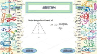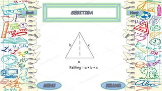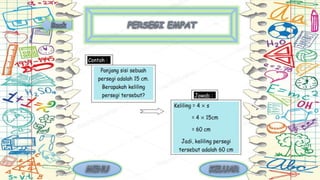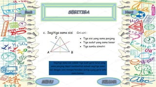 Dokumen tersebut membahas tentang definisi dan sifat-sifat berbagai bangun datar dua dimensi seperti segitiga, persegi, lingkaran, dan lainnya. Dijelaskan pula istilah-istilah yang sering digunakan dalam bangun datar seperti sisi, sudut, dan diagonal bidang.