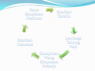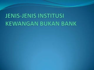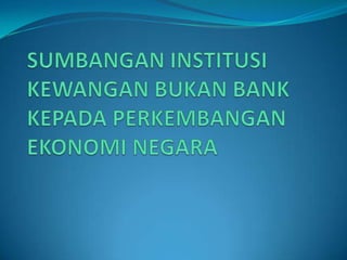 Dokumen ini membincangkan pelbagai institusi kewangan di Malaysia seperti bank dagangan, bank pusat, syarikat insurans, dan bank simpanan, serta fungsi masing-masing dalam ekonomi. Ia menyoroti peranan bank pusat dalam mengawal sistem kewangan negara dan menyediakan perkhidmatan kepada pelbagai lapisan masyarakat. Selain itu, ia juga menerangkan mekanisme pembiayaan dan pelaburan yang diambil oleh institusi tersebut, termasuk konsep kewangan Islam.