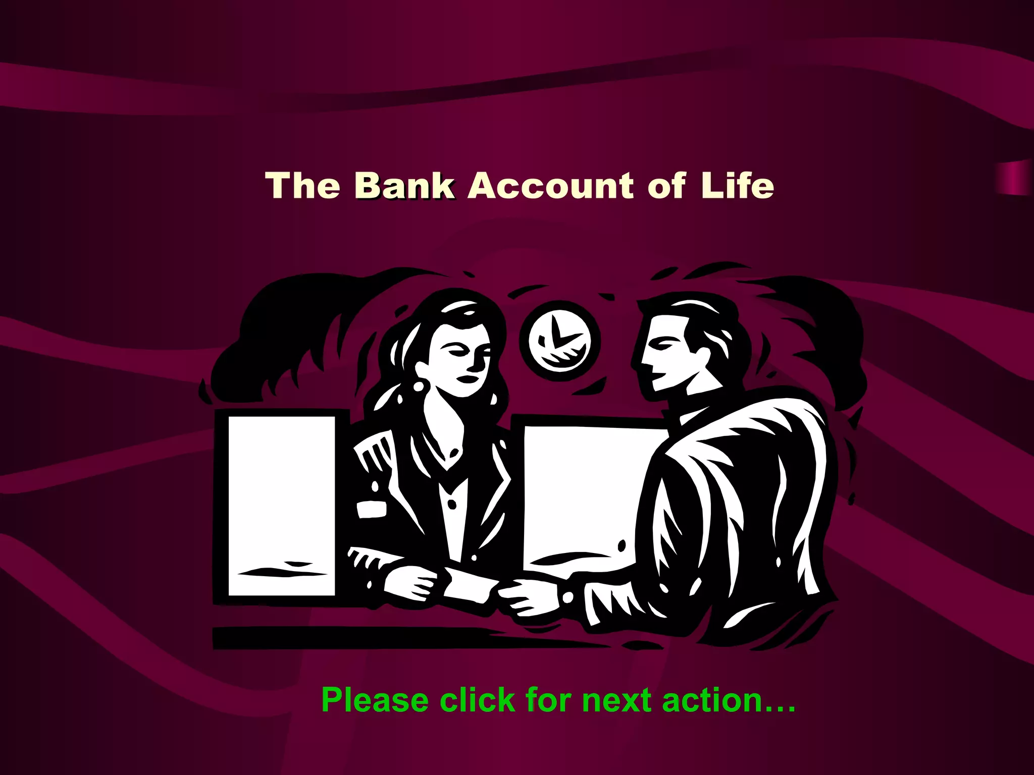 The document uses the metaphor of a bank that credits your account each day with 86,400 seconds (representing the number of seconds in a day) to represent time. Each night, any unused time is written off and lost, with no ability to carry over time to the next day. It encourages making the most of each present day and moment, as time passes quickly and is not recoverable. Friends are compared to rare jewels that support and encourage each other.