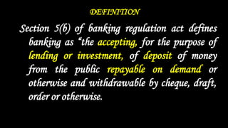The document provides information on the final accounts of banking companies according to the Banking Regulation Act of 1949. It defines banking and outlines the key features of a banking company. It describes the general accounting system and books maintained by banks, including the counter cash book, cash balance book, and ledgers. It explains that banks prepare their final accounts in a vertical format consisting of a balance sheet and profit and loss account with 16 supporting schedules providing details of assets, liabilities, revenues and expenses.