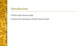The document discusses the role and responsibilities of internal audit in banks. It begins by defining internal audit and explaining its importance in ensuring governance and oversight. It then describes the various types of audits performed by internal audit such as financial, operational, and compliance audits. The document outlines the key steps in the internal audit process from planning to reporting and follow up. It emphasizes the importance of risk assessment, adherence to professional standards and tools like data analytics. It concludes by highlighting the role of internal audit in detecting fraud and emerging risks to help banks operate effectively.