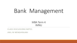 This document provides notes from a class on bank management. It begins with a disclaimer stating that the notes are intended for educational purposes only. It then outlines the course learning outcomes, course structure including assessments, and support needed from students. The rest of the document provides an overview of the history and evolution of banking in India, including the nationalization of banks in 1969 and 1980, as well as a broad overview of the various types of banks and financial institutions in India today. It also discusses the role and functions of the Reserve Bank of India as the central bank of the country.